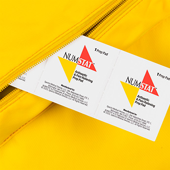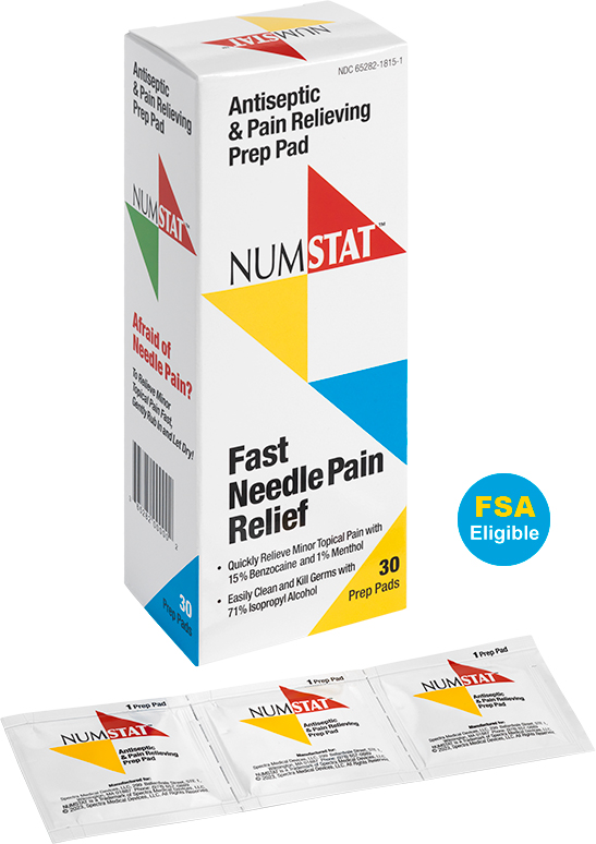 You can now prepare for needle pain with NUMSTAT prep pad. If applied in advance to the area for 60 seconds, NUMSTAT's proprietary blend will be there to relieve pain with 15% Benzocaine and 1% Menthol, while it cleans and reduces the risk of infection with 71% Isopropyl Alcohol.